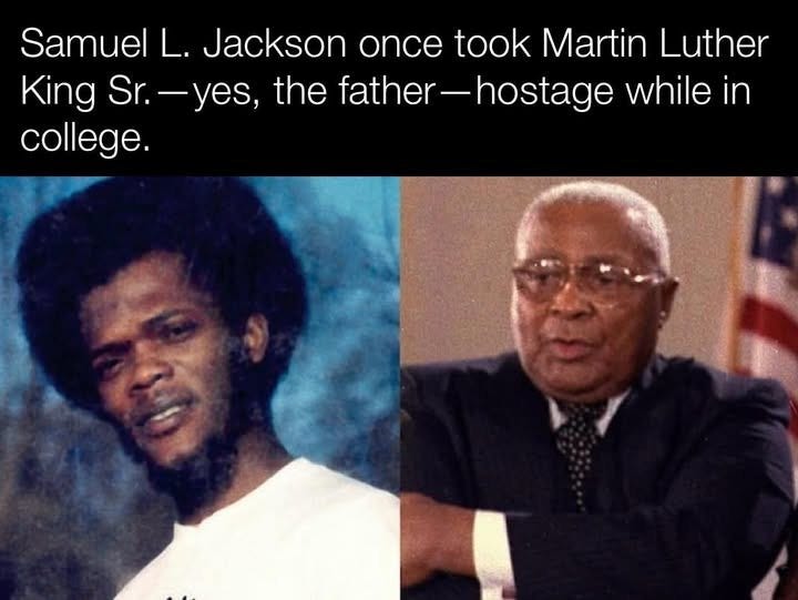 In 1969, Samuel L. Jackson and several fellow Morehouse College students held the school’s board of trustees - including Martin Luther King Sr. - hostage for two days to demand greater student involvement in matters of policy and curriculum. The protest resulted in Jackson’s two-year suspension, though King Sr. chose not to press charges and instead met amiably with him. During their meeting at King Sr.’s home, he recognized Jackson’s interest in television and suggested he explore theater arts. This conversation became a pivotal moment, inspiring Jackson to take on an actual career in acting. (Also, apparently his mother had been warned by the FBI that Jackson was likely to die within the year if he continued to be involved in the Black Power movement, as per Parade Magazine, so he got shipped off to LA for a couple years while he was suspended from school.) Jackson later returned to Morehouse and graduated with a BA in Drama in 1972.